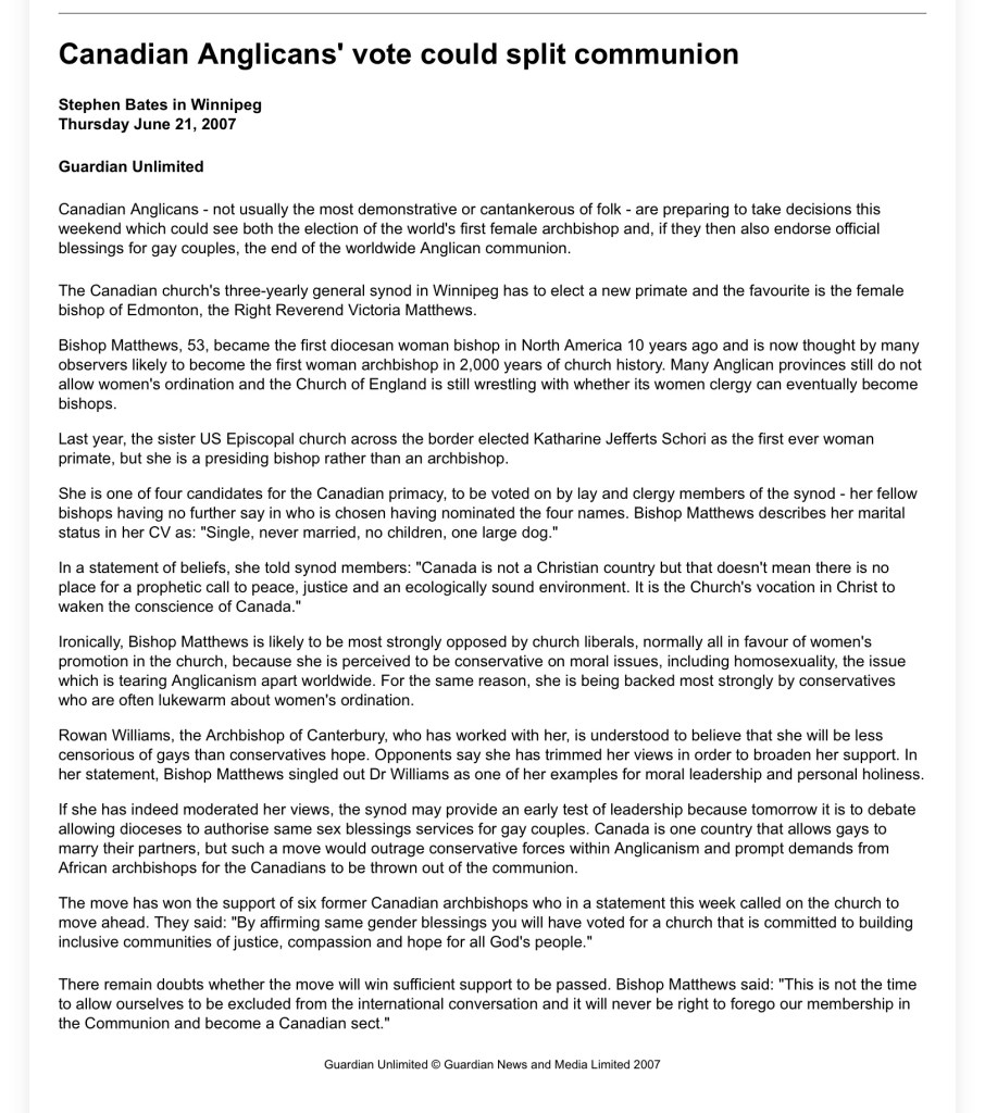 At the time, I have to admit, I thought her informal speech was a journalistic gem. I was disappointed it didn’t fly as worthy of publication. The journey taken by the Anglican Global Communion over the last few years is part and parcel of the Canadian big-picture cultural landscape.