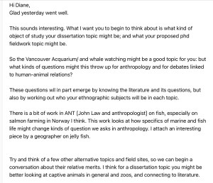 I do not wish to be delving too deep into a discussion of Anthropology. If you would like to read more on the topic, ‘Beyond the Human’, Samantha Hurn (2012) researches the idea of animal exploitation, animal-rights theory and the anthropological implications of the evolving cultural ideas and concepts about animal personhood. She asks us to think about our own attitudes towards ‘other’ animals on earth (i.e. other-than-human) and relate this to what it might mean to be human. Perspectivism (e.g. Kohn; Descola; De Castro) asks us to take up seeing the world from the point of view of the ‘other’ in the natural world, while at the same acknowledging our thoughts as being, from a human standpoint (Key words; post-humanist, human exceptionalism).