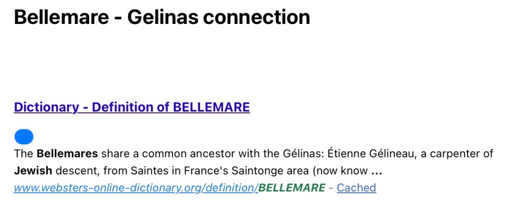 Hello Diane. According to the genealogy that I have of the Bellemare’s we are descendants of Jean-Baptiste who would seem to be the son of Jean Juillineau who took on the name of Bellemare and settled in Yamachiche. Tante Rhea told me they came from Saintes in France as your information states. My story was that the 3 brothers came from Saintes and took on the names of Gelinas (sic: Gélinas) Bellemare and I didn’t know the third name and settled in Yamachiche. I wasn’t aware that their grandfather and his son their father had come earlier and first settled in Cap de la Madeleine. I don’t have any info on Joseph Gelinas but I believe some of our ancestors went to Massachusettes. Many did in Quebec around the beginning of the 20th century. Hope things are well with you” — family member