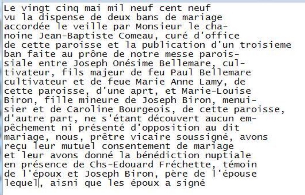 Hortense’s father was Joseph Onésime Bellemare (see archive below in Quebec Act). He signed off as “Joseph Bellemare” if you look at the end but in the text he is referred to by his full name.