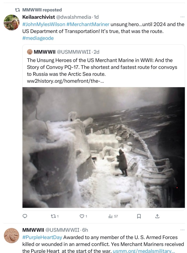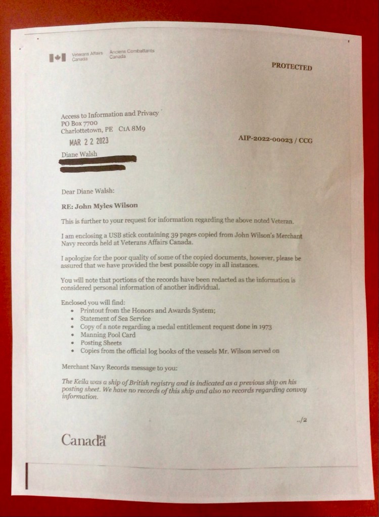 I am incredibly proud to report today that I have received in the mail this full document (39 pages) from VA 🇨🇦 on -Merchant Mariner-John-Myles-Wilson-b.1914-06-24–d.1987-08-03 which commemorates my maternal grandfather’s life as a Merchant Mariner during WWII including his medals and career sequence (on file and held by Canada). Cover Letter was also found in the envelope, addressed to myself (to be uploaded shortly). Please click on the PDF link above to view the file.