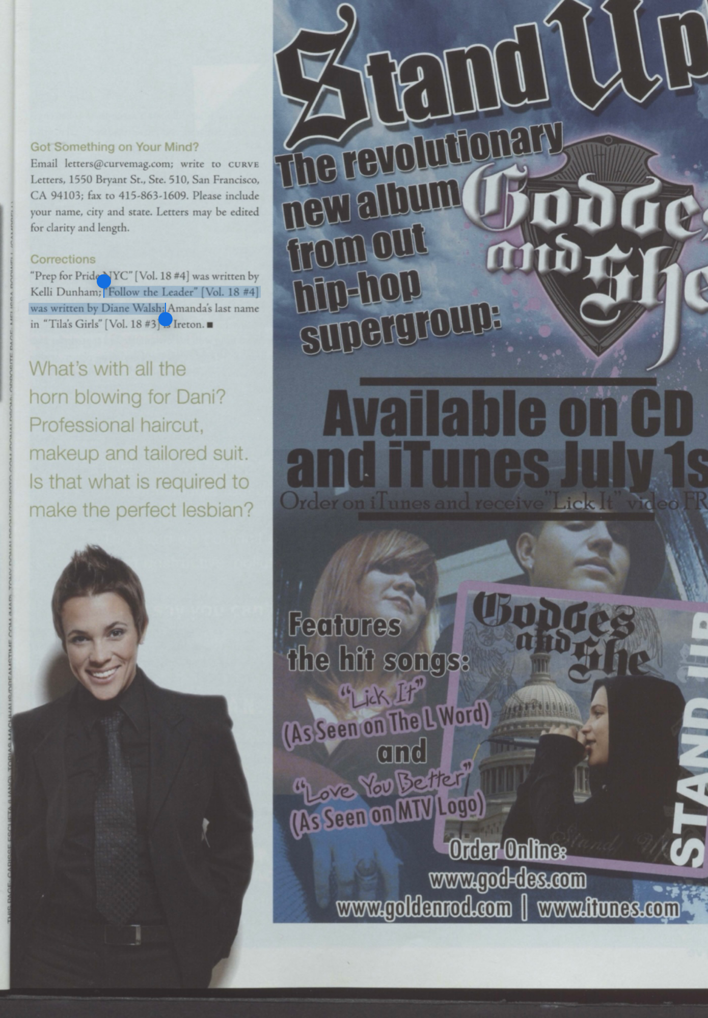 Curve Magazine: “Follow the Leader: the Head of Canada’s Green Party Helps Wave America’s Rainbow Flag”, May 2008, Volume 8, No. 4. copy
