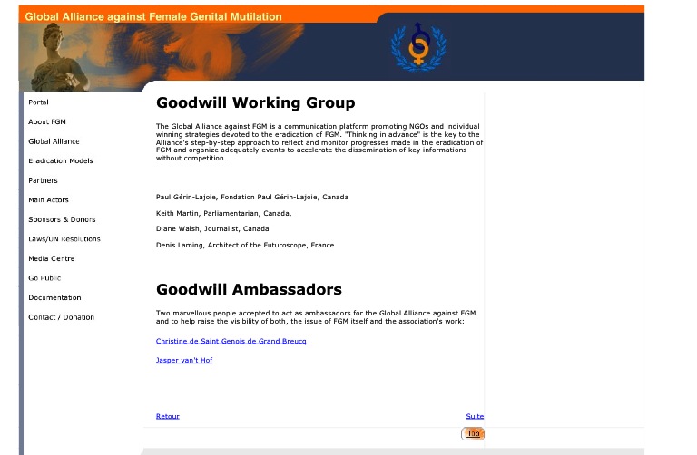 “Monsieur Holger Postulart (please note in English, Exec Director of GAFGM, Global Alliance Against FGM) va annoncer le projet de créer une Chaire universitaire spécialisée sur les MGF à cette conférence (voir communiqué de presse). L’Agence de coopération internationale allemande va être le premier donateur. l’AG-MGF (GAFGM) est en partie canadienne.”
