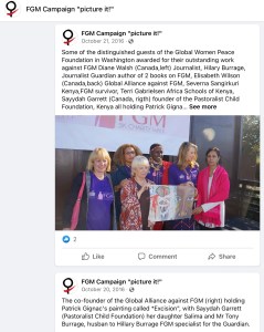 #GAFGM, hashtag – the name/phrase “Global Alliance against FGM” was coined by the founder of the Pastoralist Child Foundation, pictured above in the green scarf – Founder, Sayydah Garrett. It was later adopted by Elizabeth Wilson and co., founder of GAFGM in Geneva, with an office at UN Geneva headquarters (~ 2014). Visit here https://x.com/ewilson6404/status/1107570401029382145?s=61 for details below.