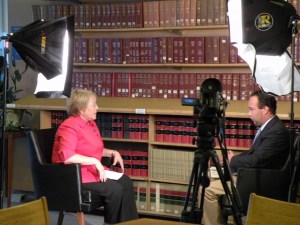 Michelle Bachelet, Head of UN Women, sitting down for her first interview on the job, with Nathan King of France 24. Diane Walsh photo.