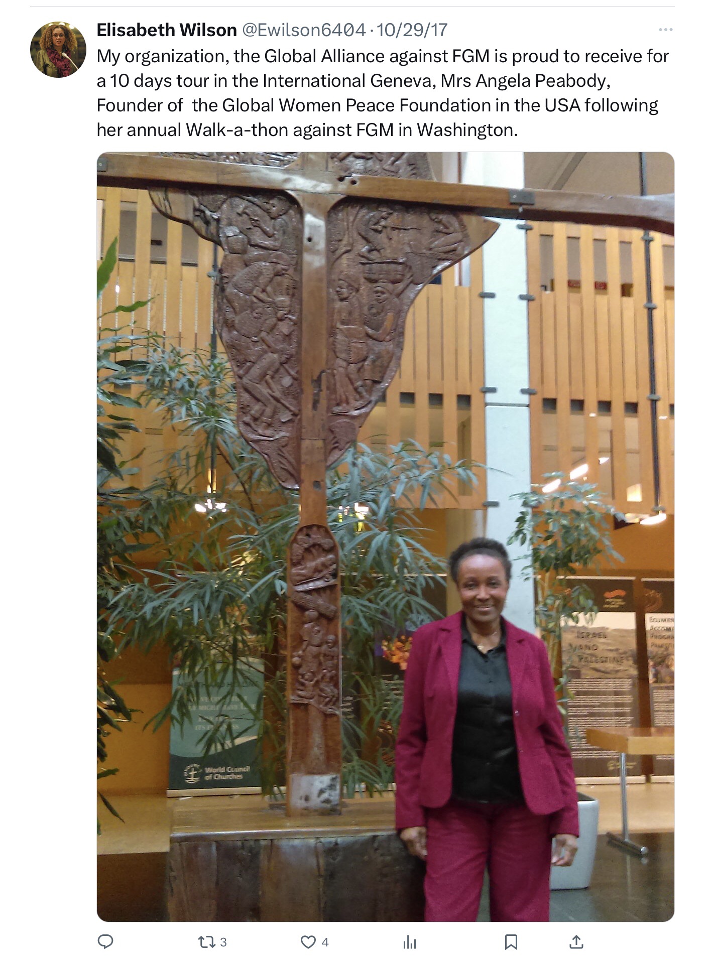 For posterity, Mediageode, c/o my more recent #AntiFGMGlobal hashtag, voluntarily maintains some of their most interesting archives and news clips. Of special note is that their activity was based in France and Switzerland and linked to UN Geneva. This organization successfully reached out and began to collaborate with other anti-FGM activist organizations outside Europe – and internationally – most importantly with the incredible Angela Peabody (pictured below), Executive Director of Global Woman P.E.A.C.E. Foundation, @1globalwoman, in the U.S. Today, the foundation is liaised with GW University. Details available upon request.